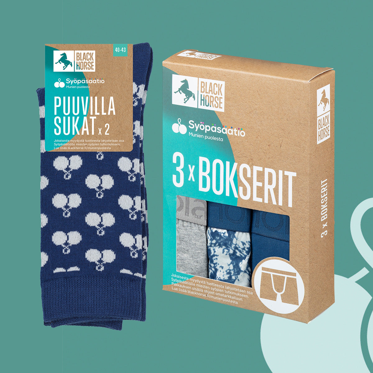 Olemme mukana tukemassa suomalaista miesten syöpien tutkimusta yhdessä Syöpäsäätiön kanssa. Ostamalla Black Horse Munien puolesta -bokserit, -sukat tai -rannekkeen tuet miesten syöpien tutkimusta.